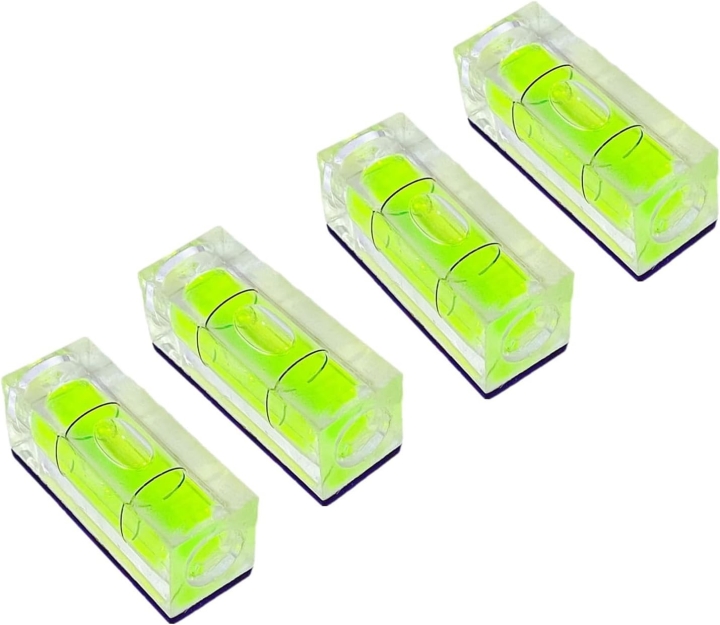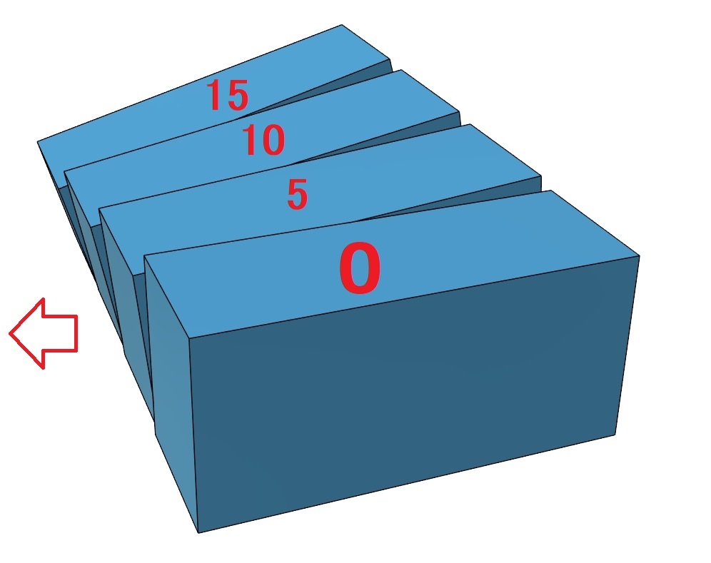 今回作るのは全く新たな発想。市販の安価な4本の水準器を組み合わせて、上り坂だけを計測する。水平、5°、10°、15°傾けた土台に4本の水準器を接着する。例えば8°の坂道では、水平と5°の土台に貼り付けられた水準器の気泡は上方に移動し、10°と15°の土台に貼り付けられた水準器の気泡は下方に留まっている。傾斜度は5°と10°の間にあることがわかる。ギヤを選ぶのはこれで十分だろう。
