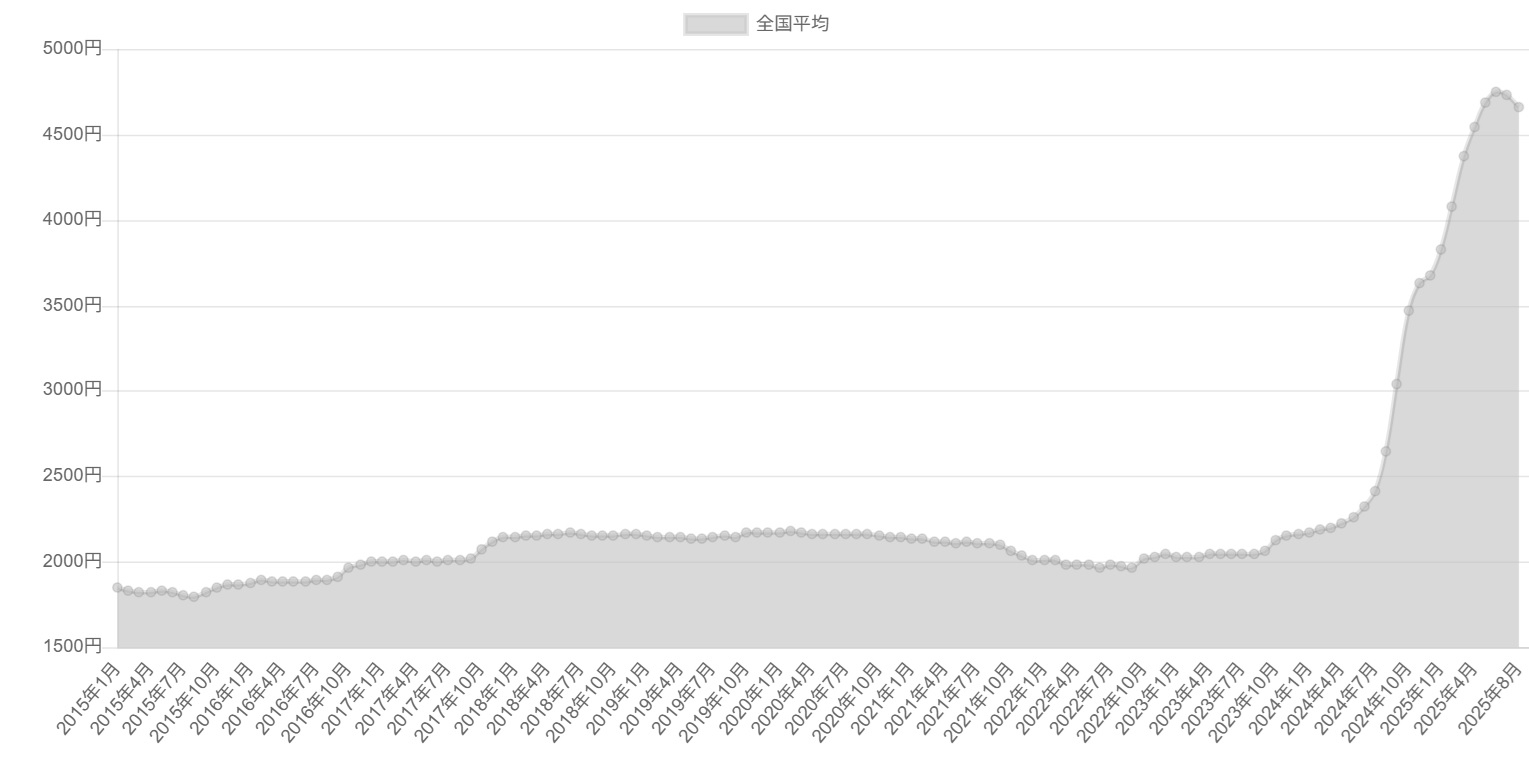 「新米の美味しさは何か月味わえますか?」と検索。2か月だそうだ。5kgの価格の推移をグラフで見ると4500円。