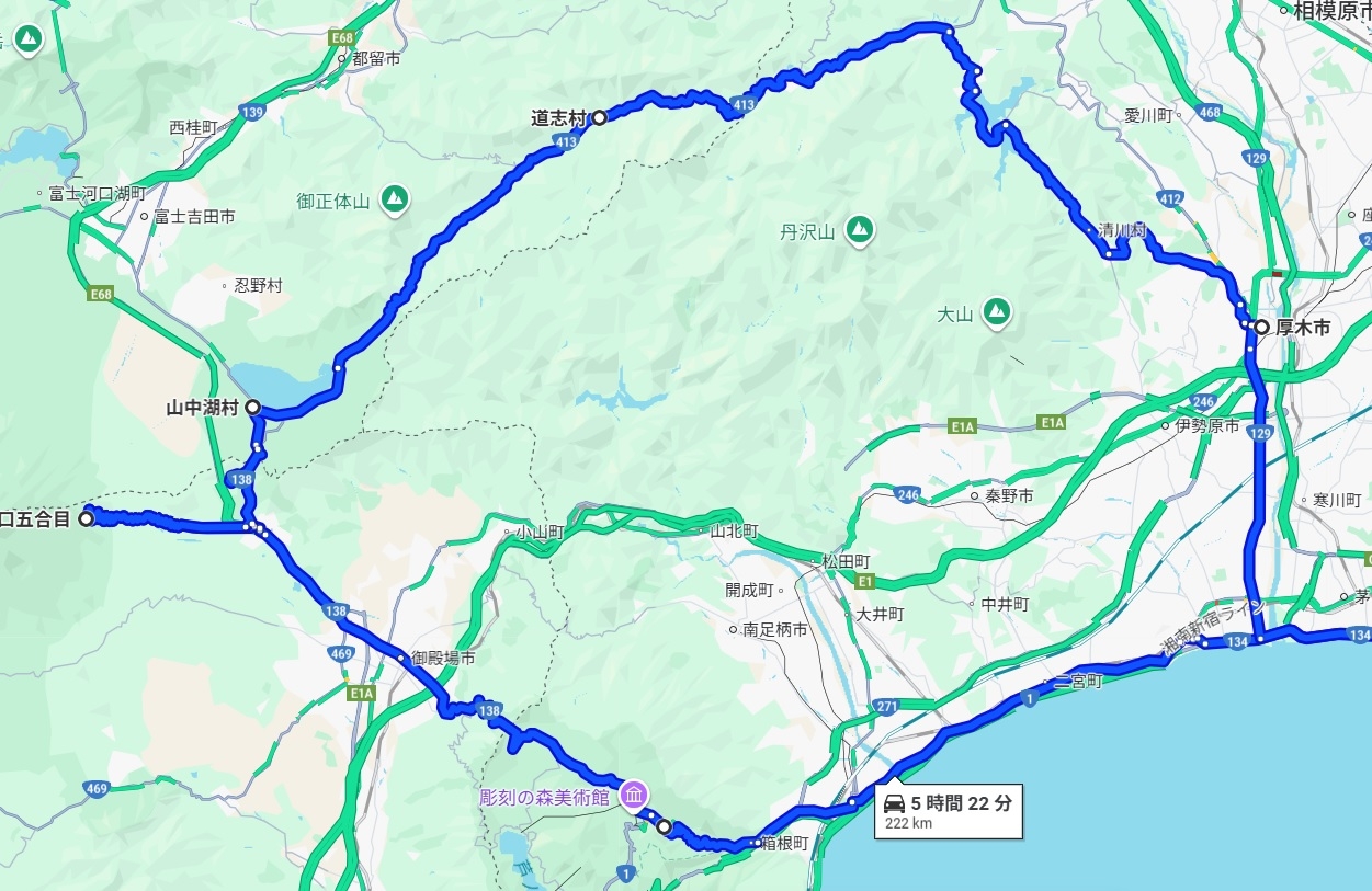 早朝出発⇒箱根⇒御殿場⇒道の駅すばしり⇒ふじあざみライン⇒須走口五合目⇒山中湖⇒道志道⇒山際の町⇒帰宅