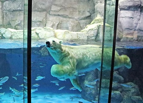 この違いは何だろうと考える。アクアミュージアムは単なる水族館ではなく、サーカスの趣向も取り入れている。しかし芸をしないシロクマ君にまで観客サービスするようにしつけているとは考えにくい。水だ!動物園にも池は用意されているが真水だろう。しかも淀んでいた。一方アクアミュージアムの水槽の水は透明な海水に違いない。海水をきれいに保つ技術はお手の物だ。