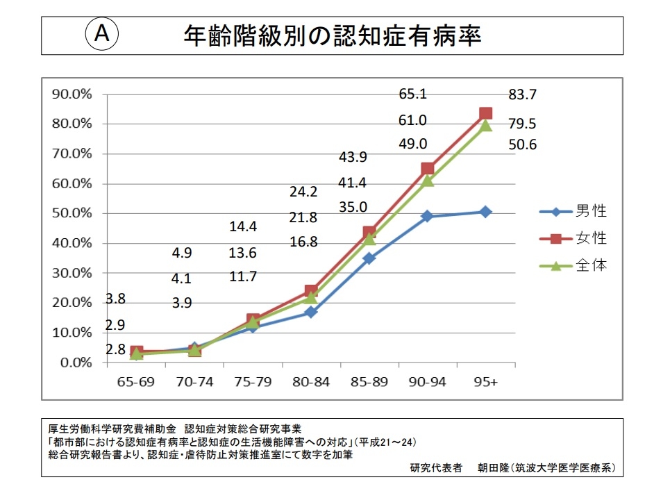 ・95歳+を見ると、男性は認知症率50%、女性は90%に近いのに、両方合わせると女性の値に近いのは、いかに男性の数が少ないかを表しているのでしょうか?