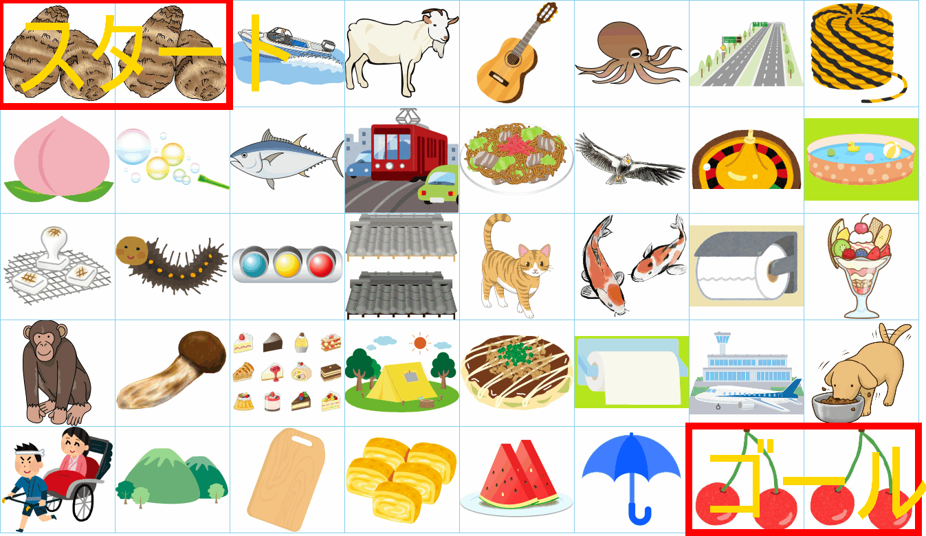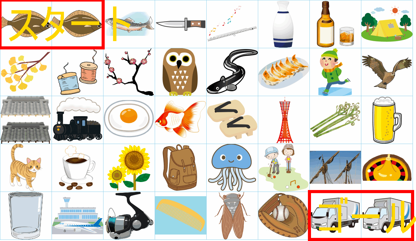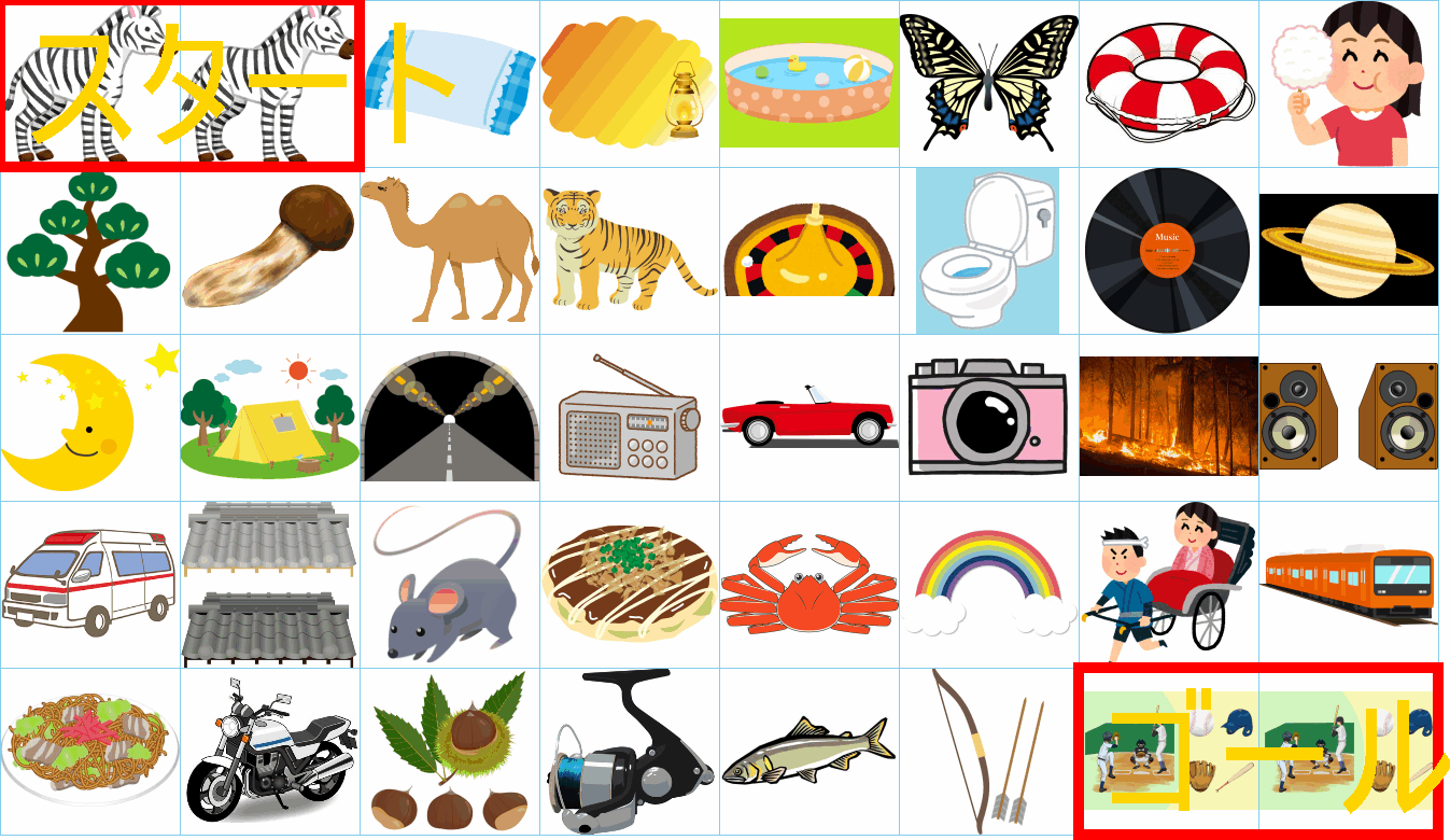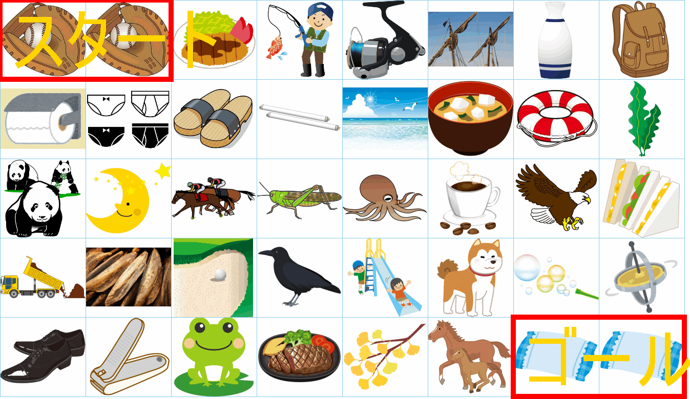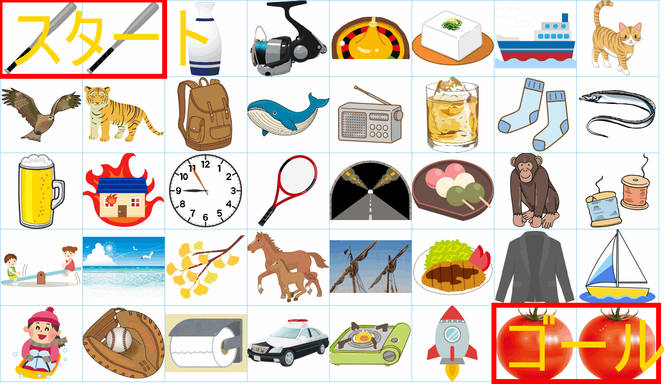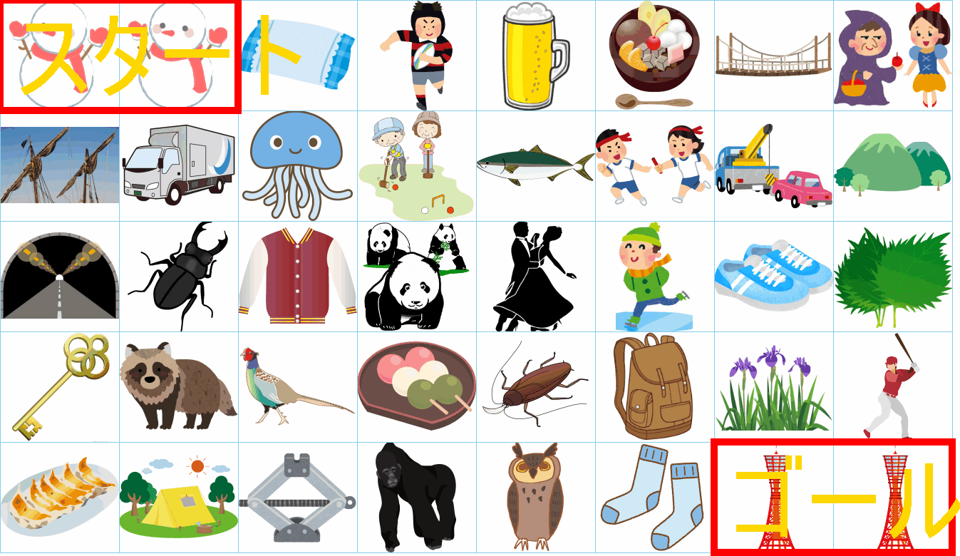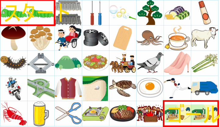 これは非常に面白い挑戦ですね!画像にあるイラストを「しりとり」でつなぎながら、左上の「スタート」から右下の「ゴール」まで一本道を作るパズルですね。