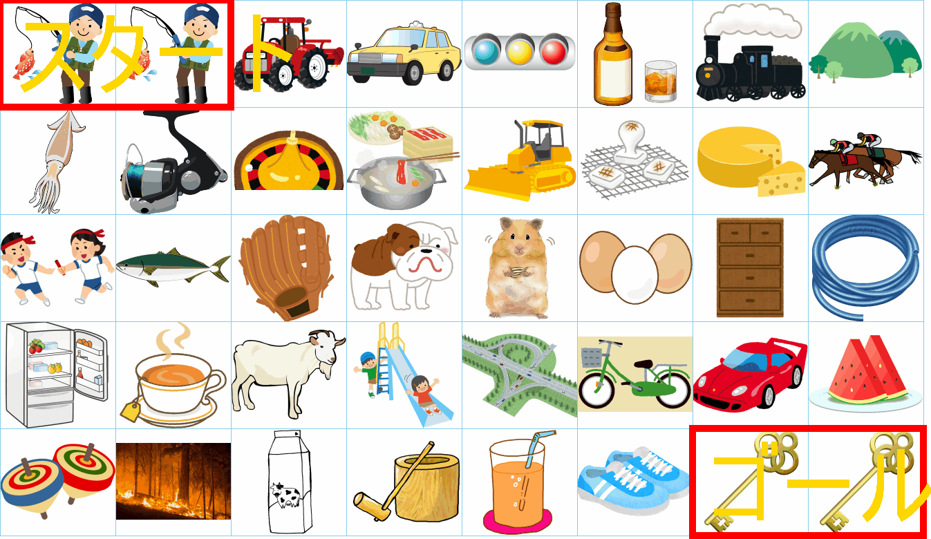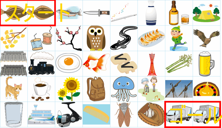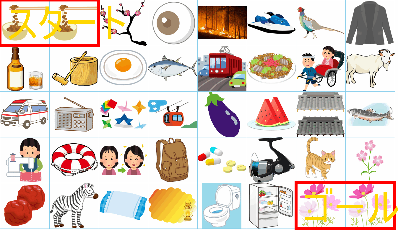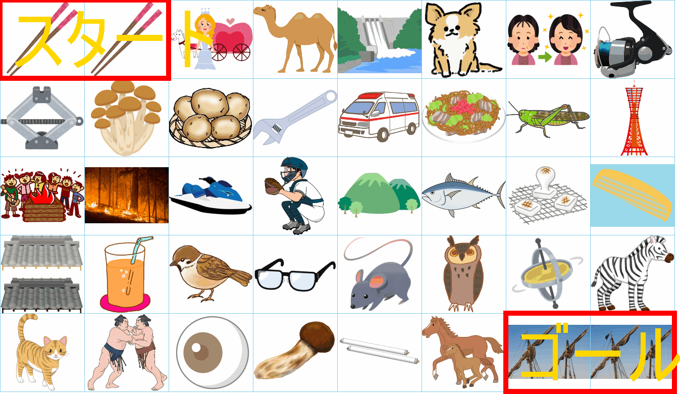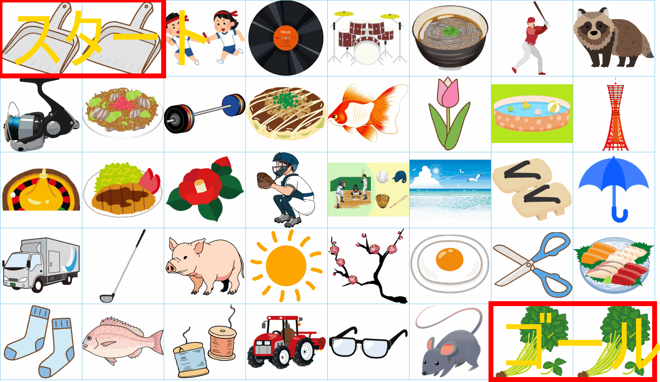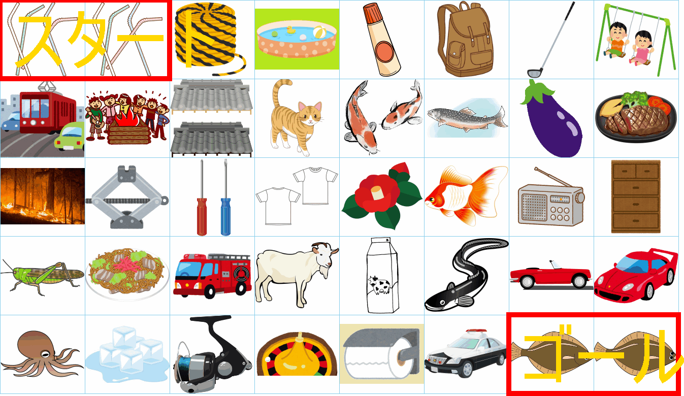これは非常に面白い挑戦ですね!画像にあるイラストを「しりとり」でつなぎながら、左上の「スタート」から右下の「ゴール」まで一本道を作るパズルですね。