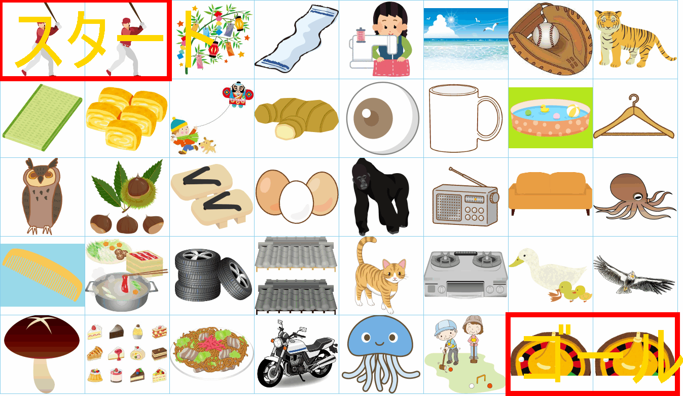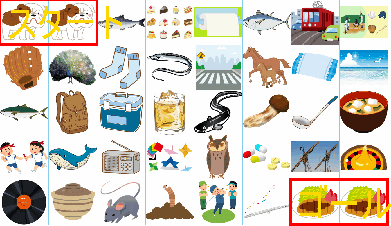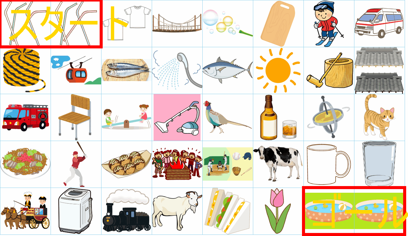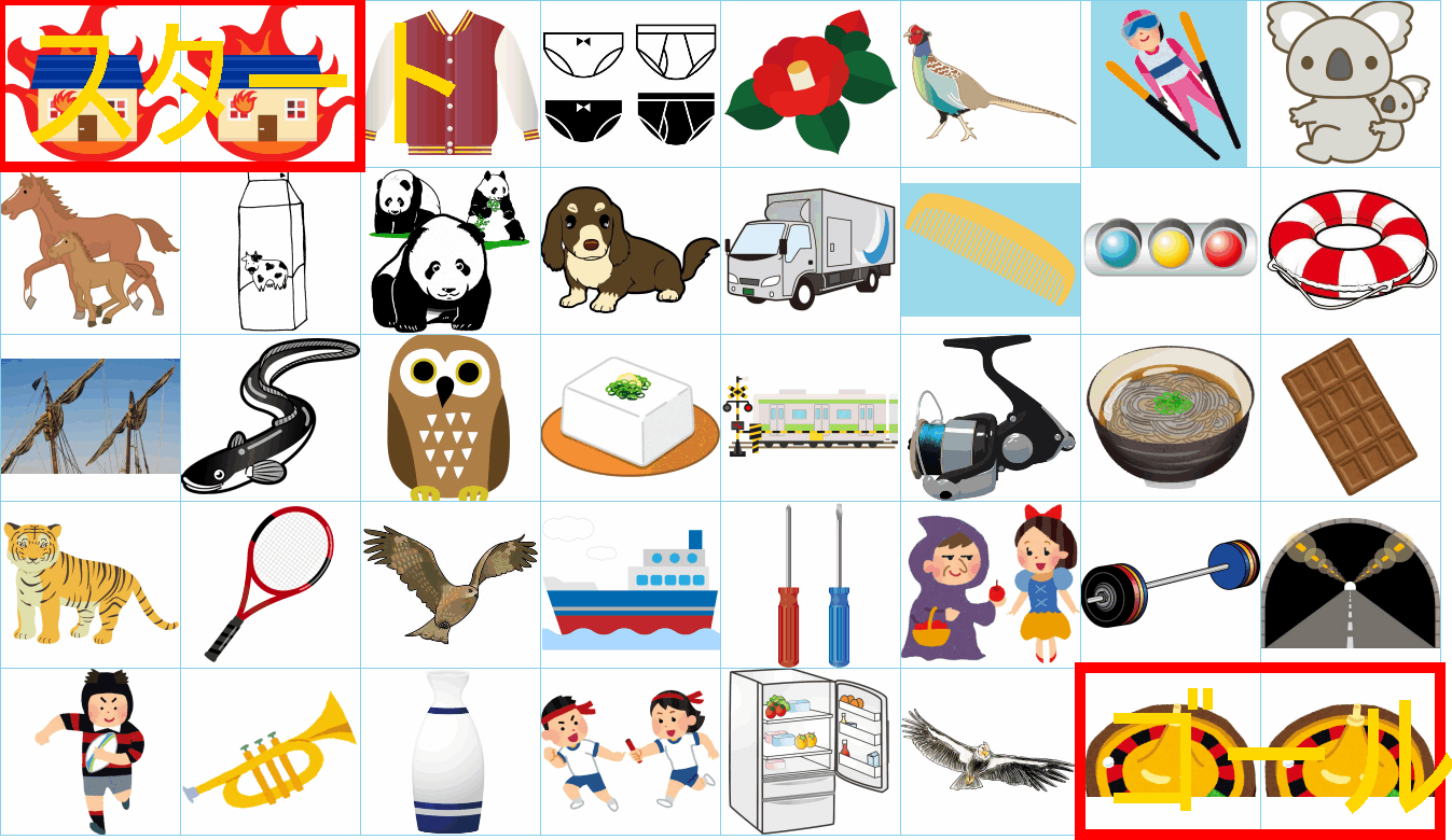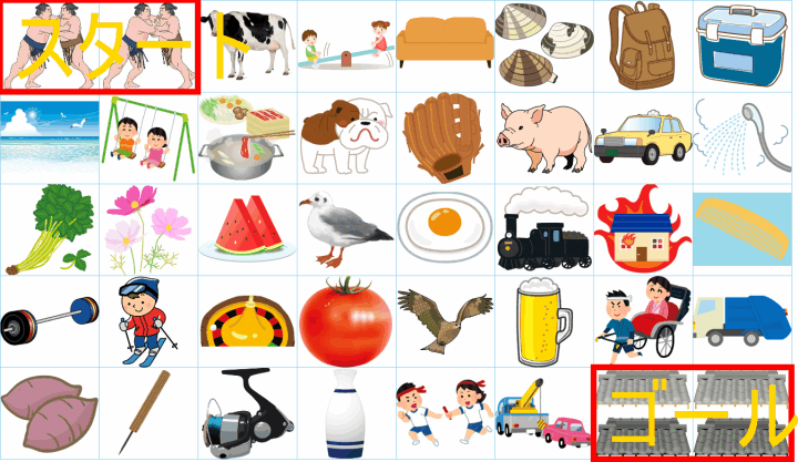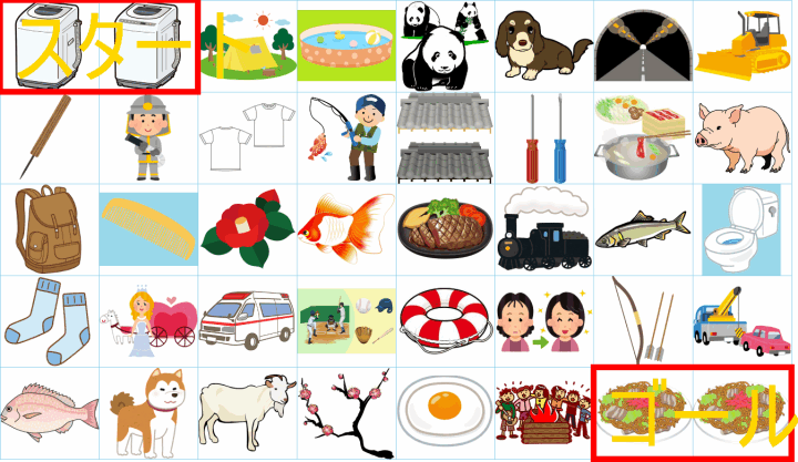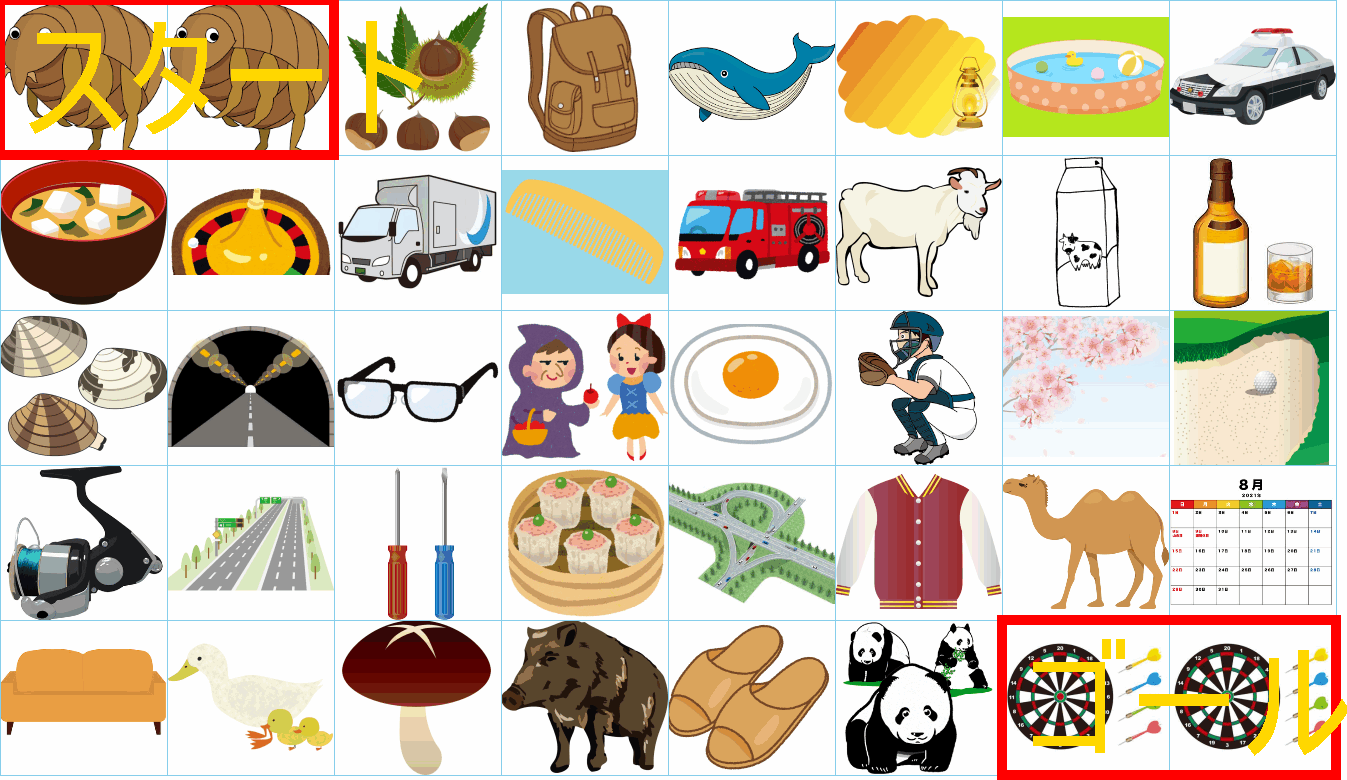 これは非常に面白い挑戦ですね!画像にあるイラストを「しりとり」でつなぎながら、左上の「スタート」から右下の「ゴール」まで一本道を作るパズルですね。