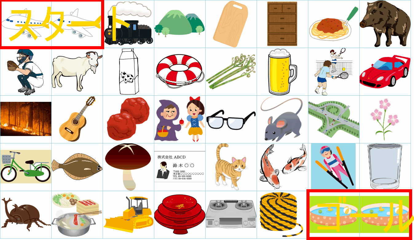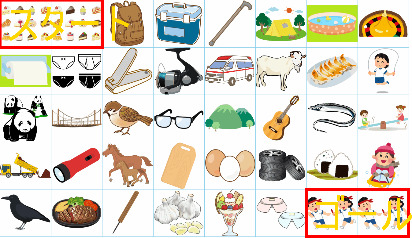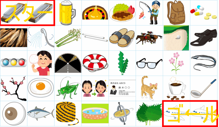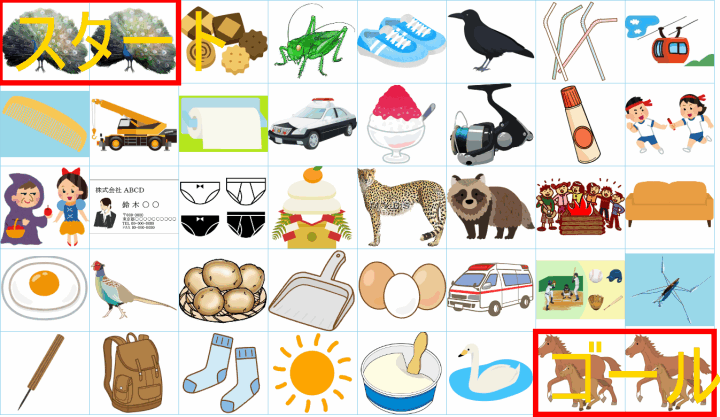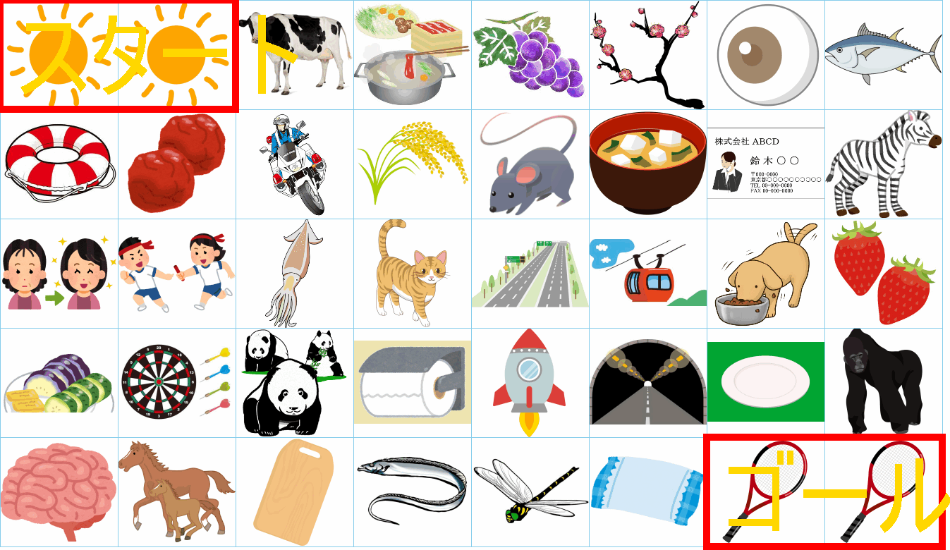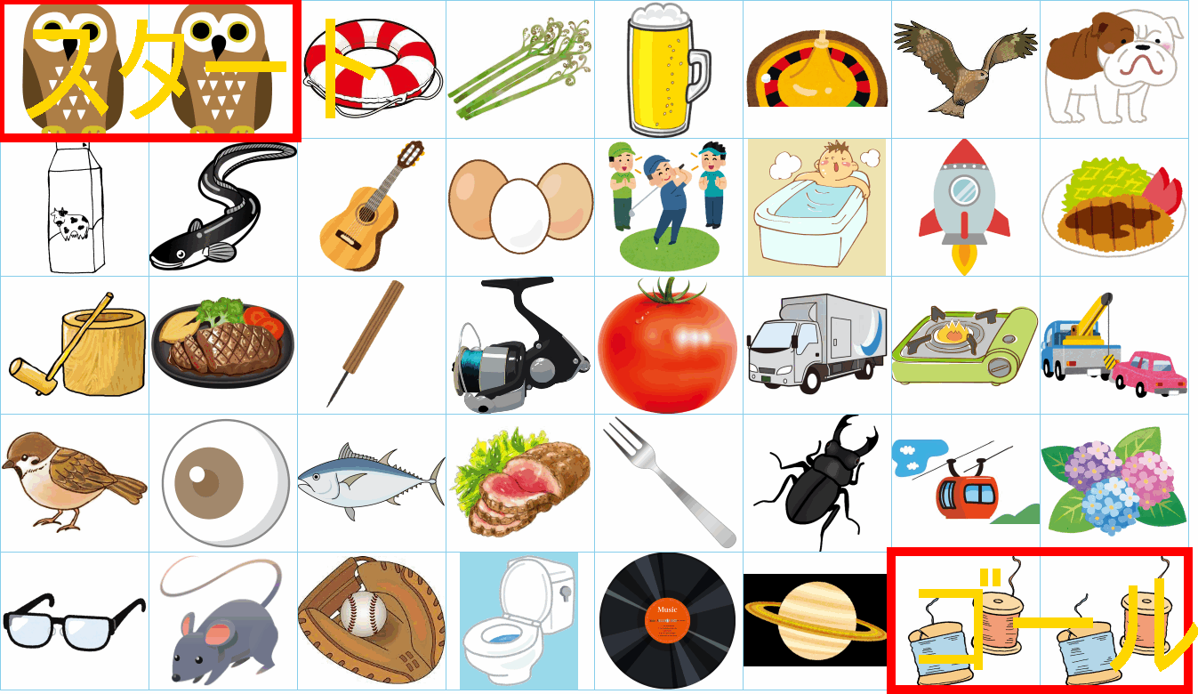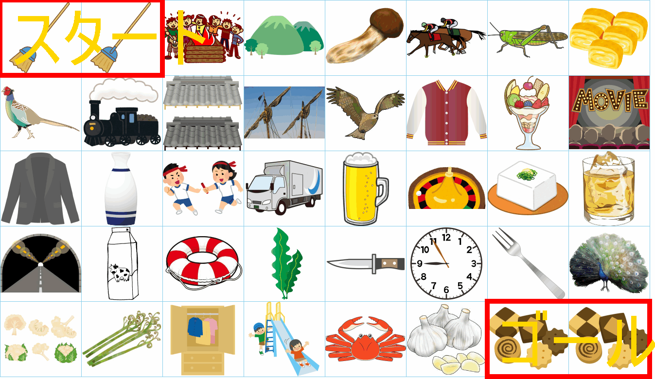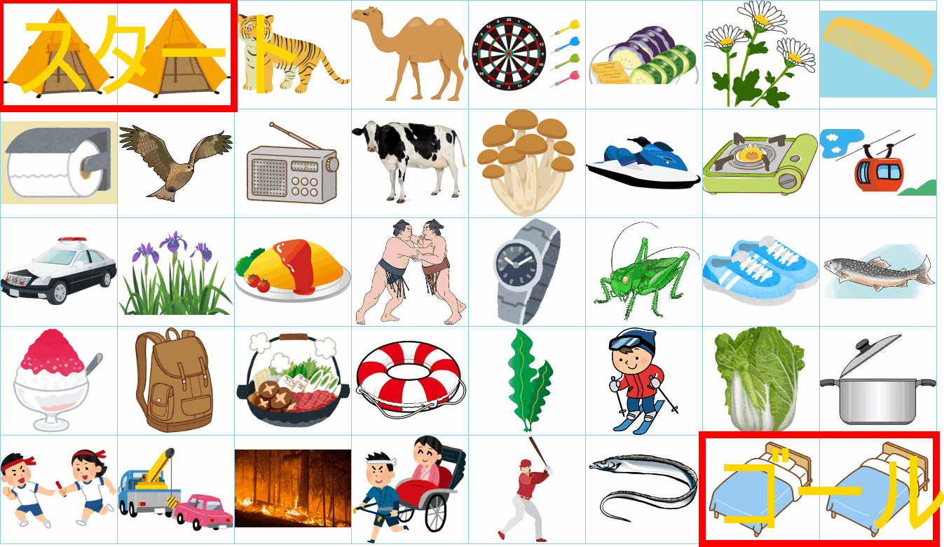 これは非常に面白い挑戦ですね!画像にあるイラストを「しりとり」でつなぎながら、左上の「スタート」から右下の「ゴール」まで一本道を作るパズルですね。