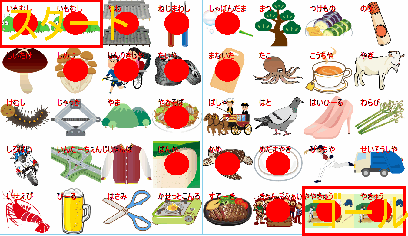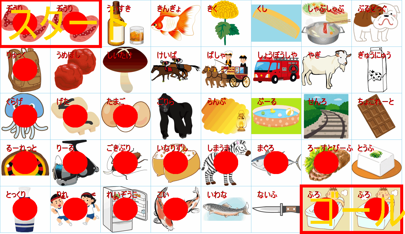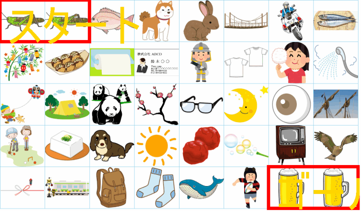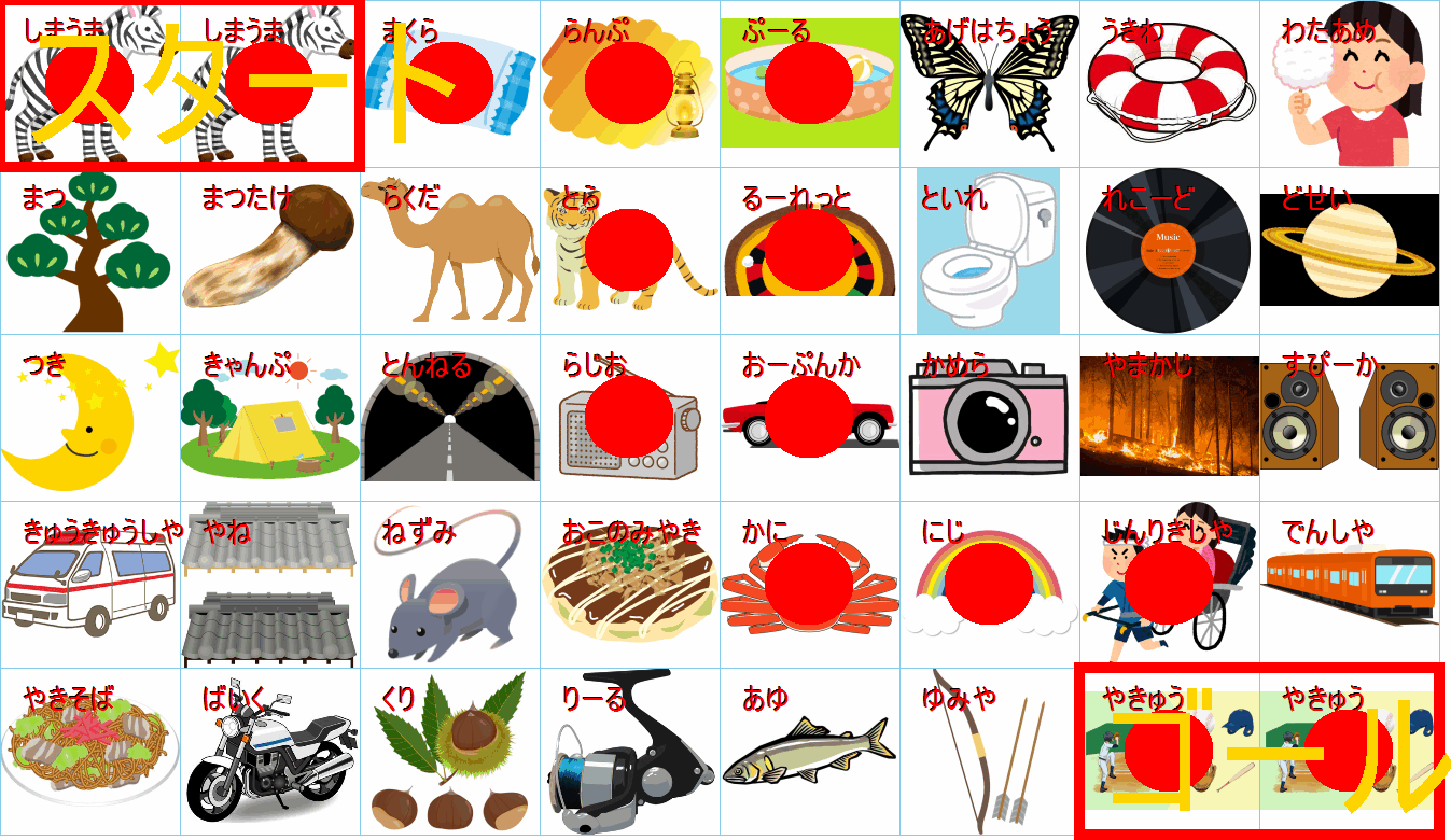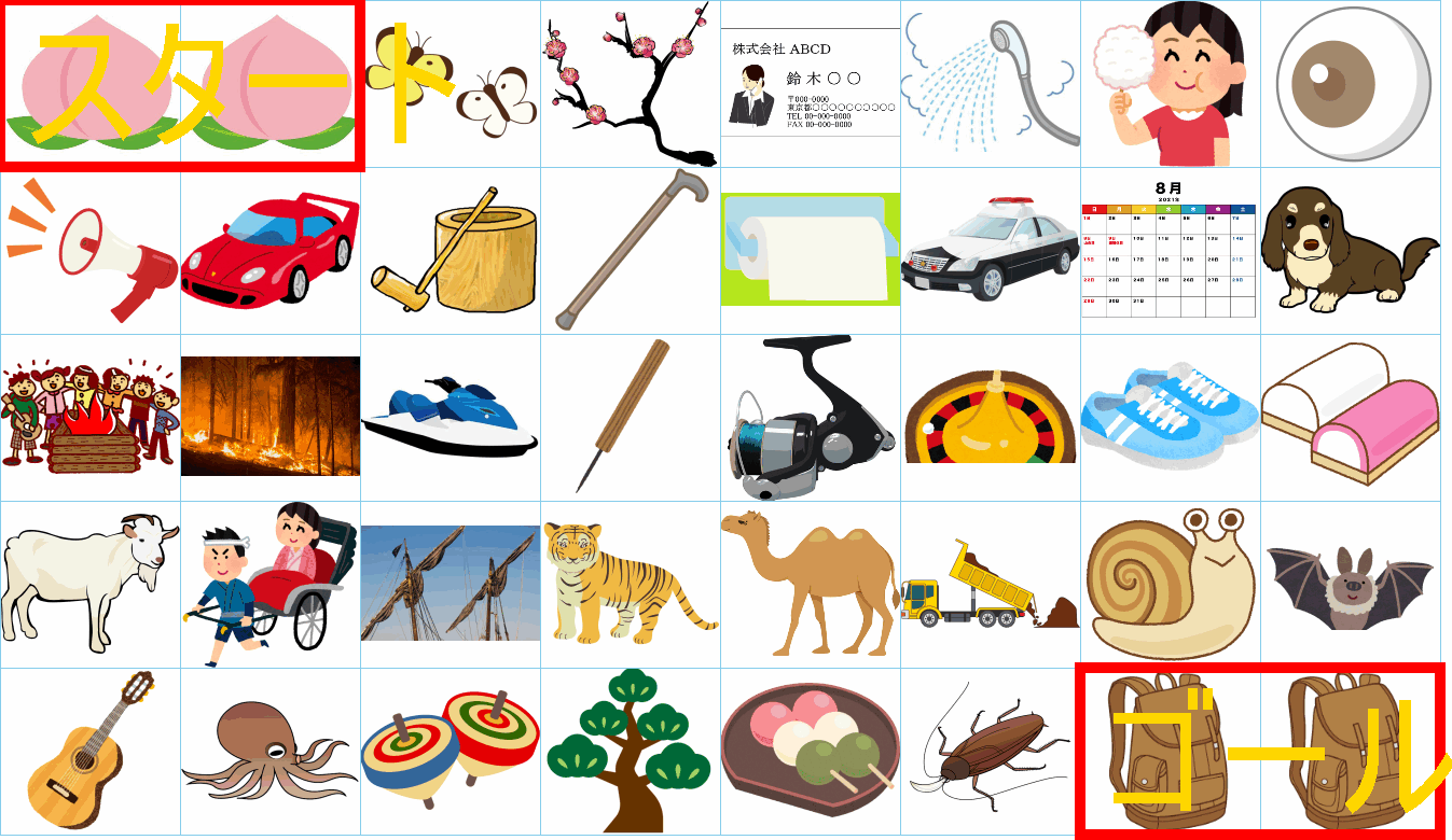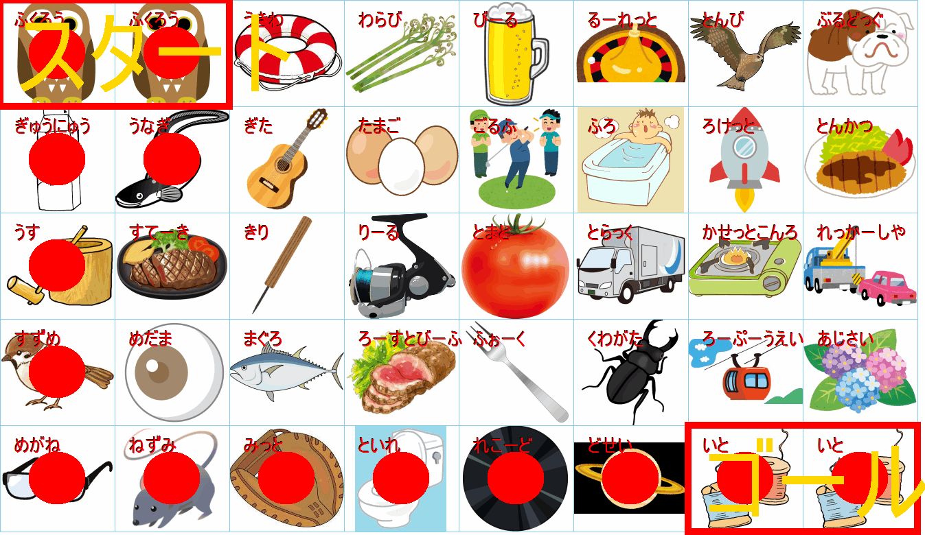 これは非常に面白い挑戦ですね!画像にあるイラストを「しりとり」でつなぎながら、左上の「スタート」から右下の「ゴール」まで一本道を作るパズルですね。