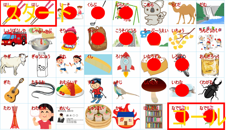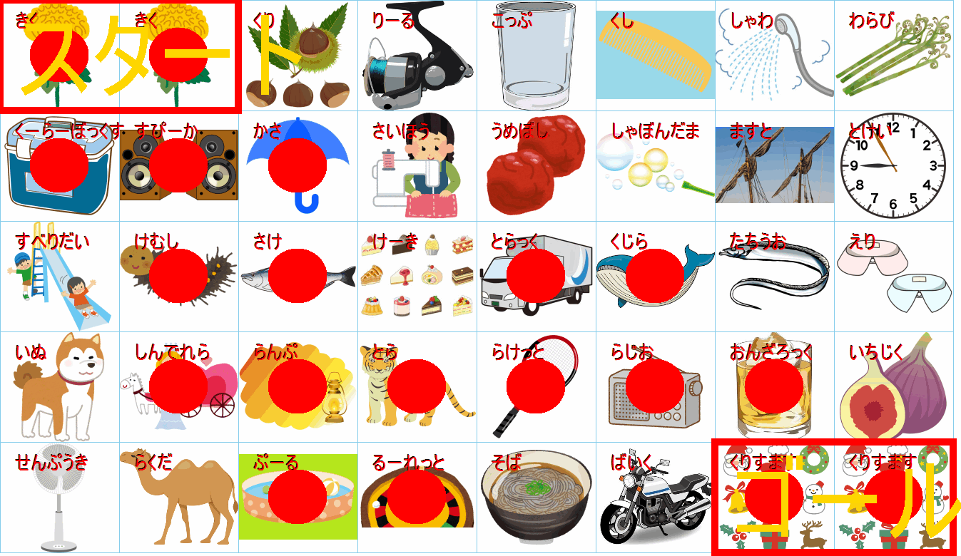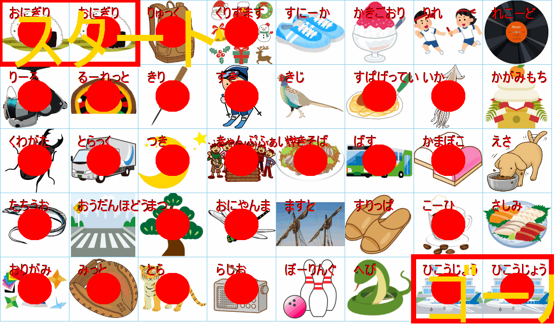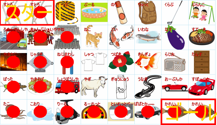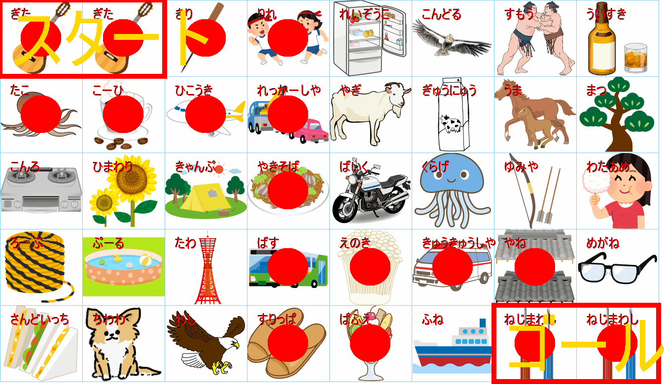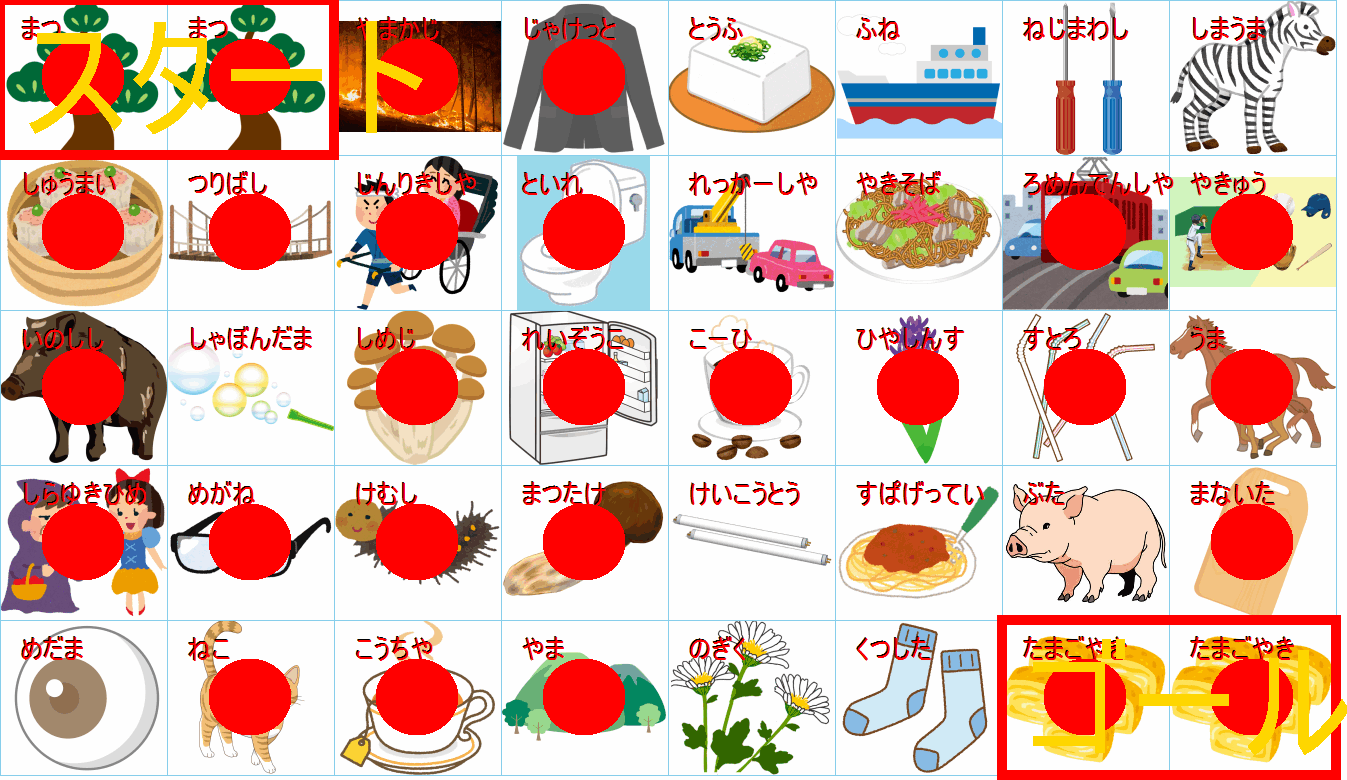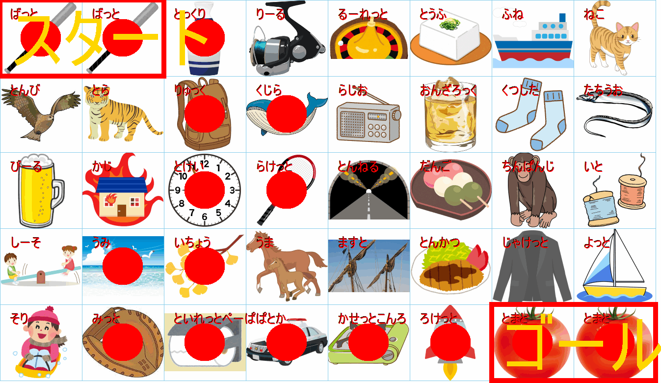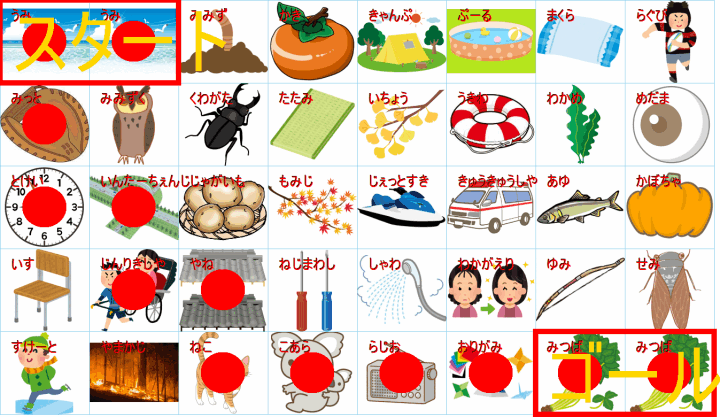 このまま行くと迷路のようになりますが、右下のゴール(野球:ベースボール)の直前は「キャンプファイヤー」か「焚き火(たきび)」に見えます。