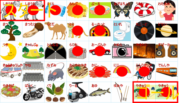 ゴール直前の 「キャンプファイヤー(あ)」 または 「たきび(び)」 から、「ゴール(野球:やきゅう)」 へつなぐためには、その前は 「ヤ」 か 「ユ」 で終わる言葉が必要ですね。